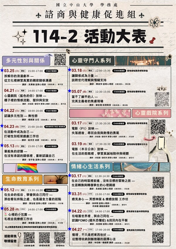 【公告】114-2諮健組活動大表來囉!這裡有很多西灣種子認列活動喔~