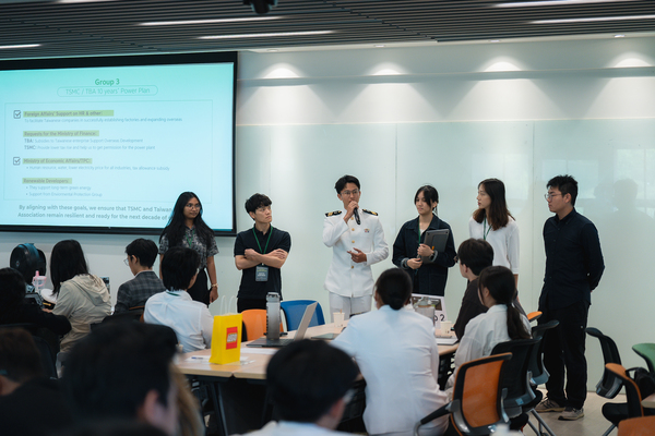 本次工作坊的一大亮點安排了「Sustainability Table-top Exercise- Powering a Better Future」。以情境模擬會議方式進行,模擬2030 年,中東多國爆發嚴重社會動盪與武裝衝突,導致全球石油與液化天然氣(LNG)的生產與出口大幅下降,國際燃料價格迅速上升,許多依賴進口能源的經濟體難以確保穩定供應。學生分成6組,分別代表不同團體進行危機管理演練,包含環團、經濟部(台電)、半導體產業、財政部、外交部、再生能源開發商。透過危機情境,讓學生扮演不同決策角色進行實戰演練,換位思考,訓練風險控管能力、加速決策、強化溝通協調,並在時間壓力下應對國際時事、商業危機或公共事務的風險。最後以「小組簡報」的方式,讓6組學生分享解決策略,以及與其他小組溝通談判的心得。小組成員包含中山大學本國生、外籍生與海軍官校學生,在多方角力的談判過程中,學生展現了極佳的溝通協調與應變能力,將理論知識轉化為具體的策略提案。這場結合實務深度與國際廣度的交流,不僅厚植了學生的職場軟實力,也再次證明了面對氣候變遷與能源安全,多元觀點的對話與合作才是通往永續未來的關鍵途徑。